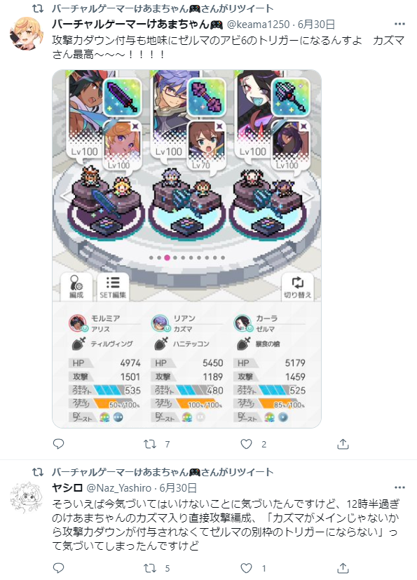 | カズマを採用した低レア編成です。 カズマはパーティ全体を回復しながら敵に攻撃力ダウンを付与できるため、パーティ全体の耐久力を大きく上昇させることができます。闇属性には回復キャラが少ないため、耐久編成を組む場合には選択肢の1つとなるでしょう。 本来、アドミニスター地獄級は直接攻撃編成での相性はあまり良くありませんが、今回の編成は耐久力が高いため、低レアでも比較的に安定してクリアすることができます。開幕ゲージ100%からの強化効果解除を持っているため、光廃竜イルメタレイに挑むのにも使用できます。 カズマ、オリヴィエ、ゼルマは敵に攻撃力ダウンを付与できるため、ゼルマのアビリティ1によって別枠でダメージを伸ばせるのもオシャレポイントとなっています。 |