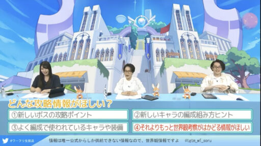 皆様からお寄せいただいた議題やワーフリ運営チームからプレイヤーの皆様へ伺ってみたいことをテーマとし、出演者や視聴者の皆様と話し合っていきます。いただいた議題や回答の一部を生放送内にて取り上げさせていただく予定です。