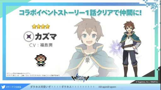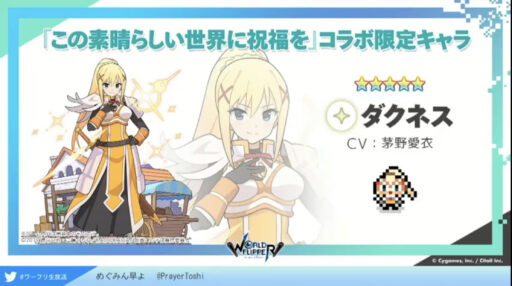 (アクア、めぐみん、ダクネスは限定ガチャ。カズマは配布キャラとのこと)