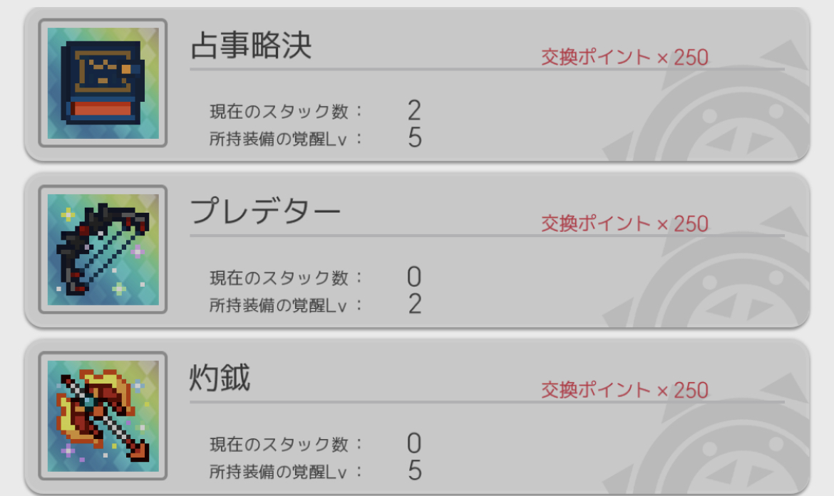 火属性武器ピックアップ一天井分 占事略決lv3、プレデターlv1、灼鉞lv3からこうなった 天井交換はプレデターにしたのでガチャからは一回も引いてない プレデターは搾られてる(確信)