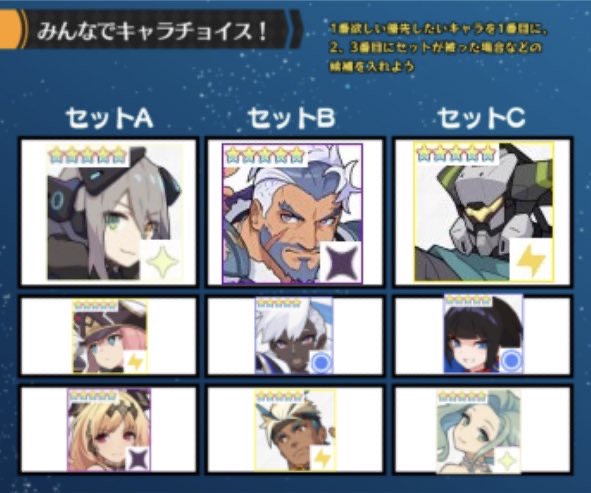 前もって他の2人と意見を合わせておくことで、欲しい★5キャラ3体を入手できるため「みんなで選ぶ」がオススメです。もし他プレイヤーとの意見交換が面倒な場合は「ひとりで選ぶ」を選ぶと良いでしょう。