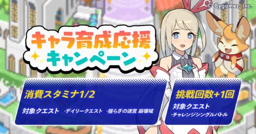 「キャラ育成応援キャンペーン」は、対象のクエストの消費スタミナが減ったり、ドロップ率が上昇するほか、チャレンジバトルへの挑戦回数が増加するイベントです。名前の通り育成素材が入手しやすいイベントとなっているので、エレメントや夢見の紋章が足りない方はこの機会に周回を目指しましょう。対象ステージやドロップ倍率は開催されるたびに変更されます。