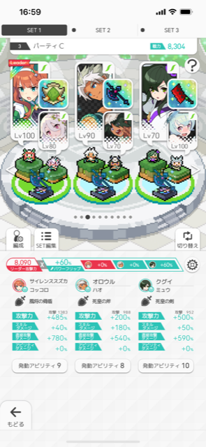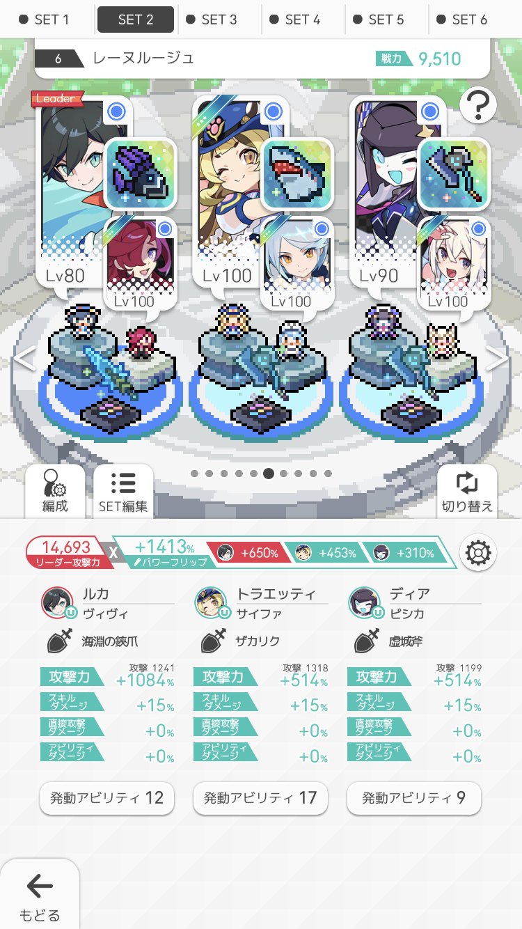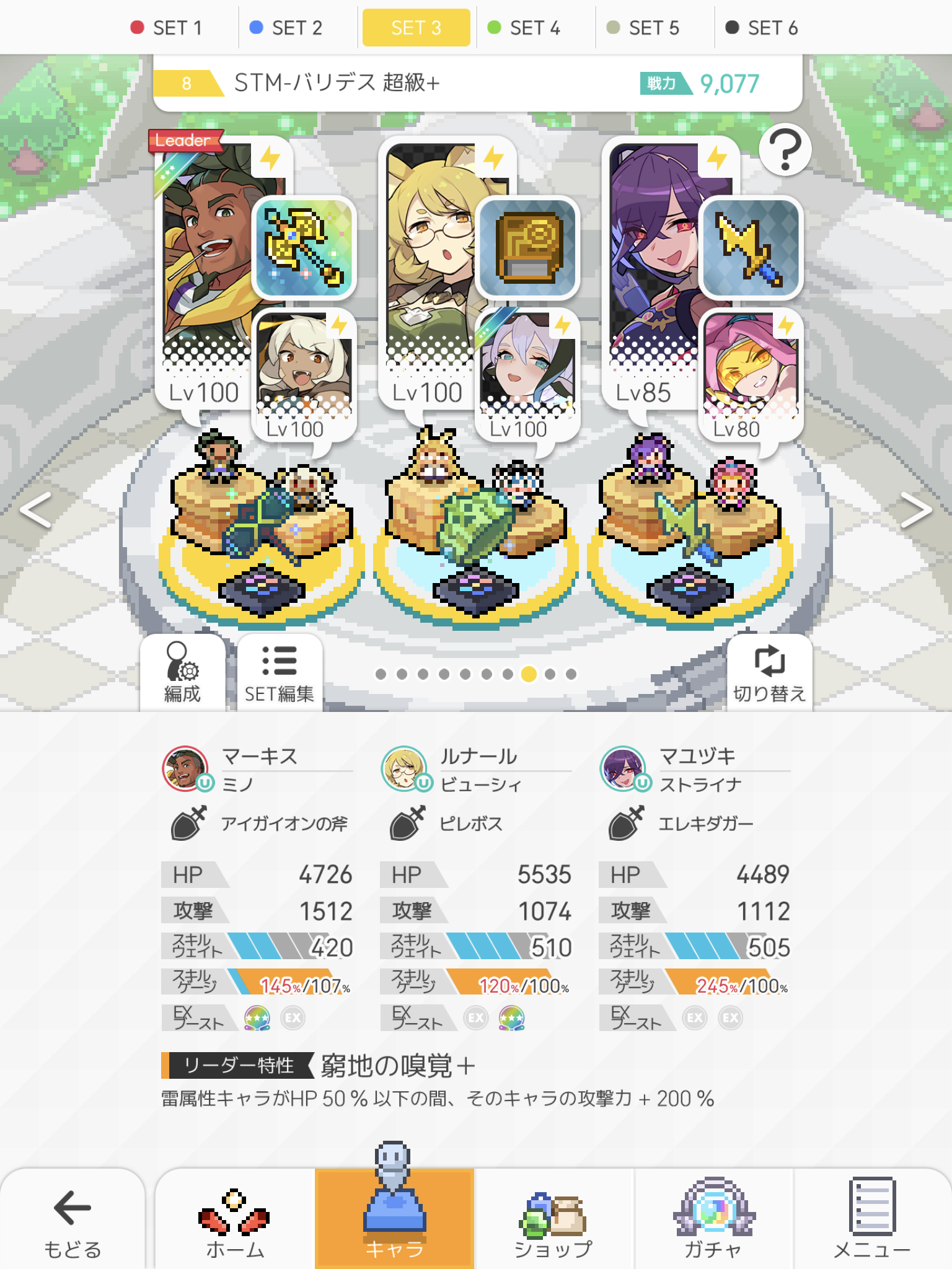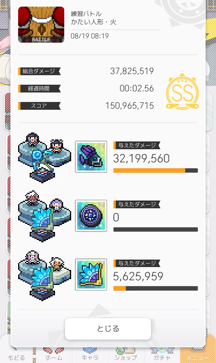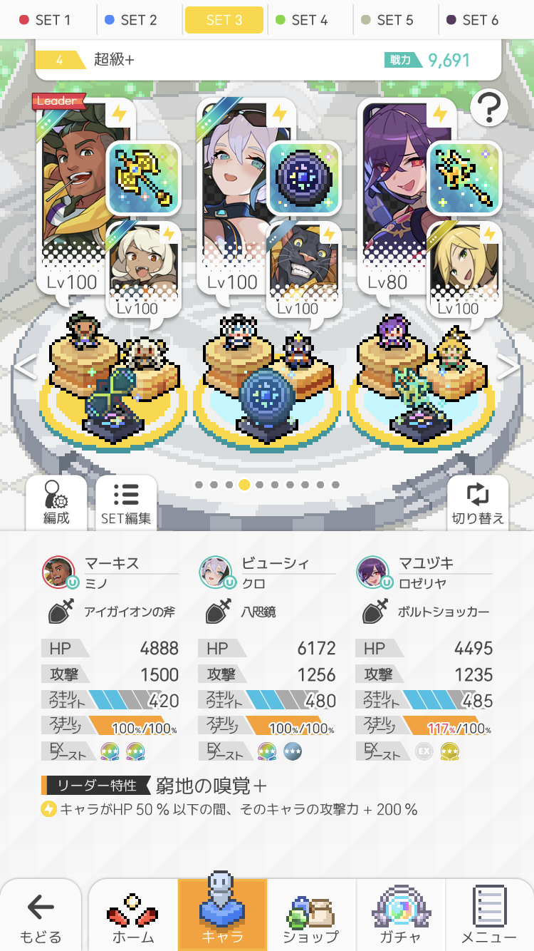 メイン火力②、この編成の要。クグイのアビリティによるスキルチャージ速度アップ、直接攻撃強化、ミュウの30コンボ毎のスキルゲージ増加を利用して頻繁に回復スキルをうつことで耐久できるようにしています。死皇の剣を持つことでスキルでもそれなりのダメージが出ます。