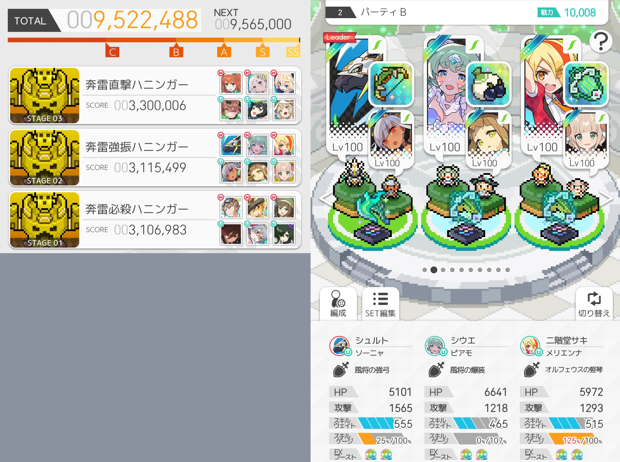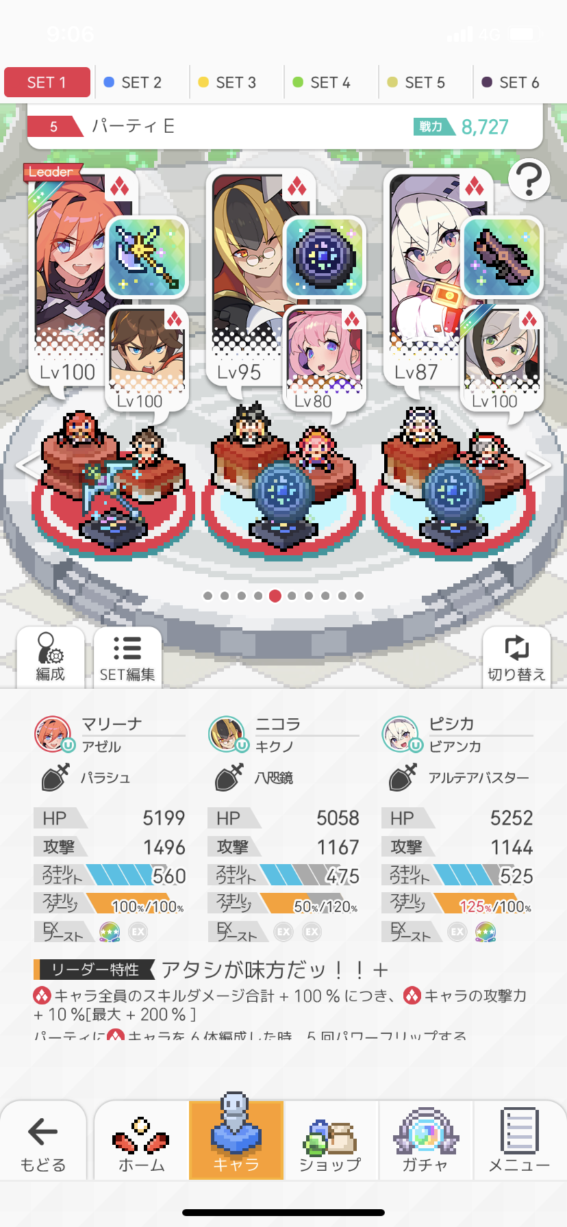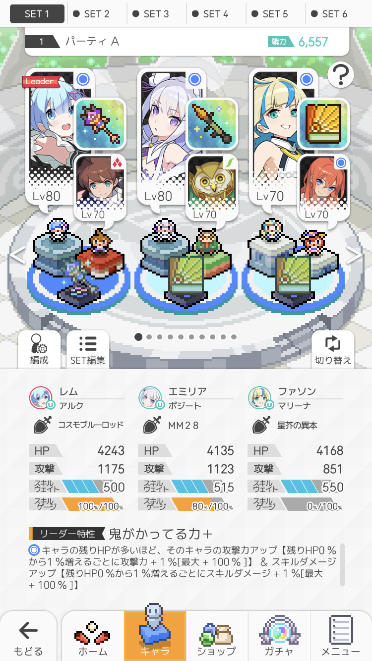 ナシール使ってるのと即死玉を防ぐ手段入れてないせいで安定度は高くない(試しにプレイした結果フルオートでクリア率3/5)、レベルは全員100だがマナボ2はクリビアが大枠取ってるだけで行けたから高速or安定パ作成までの繋ぎとしてなら使えると思う